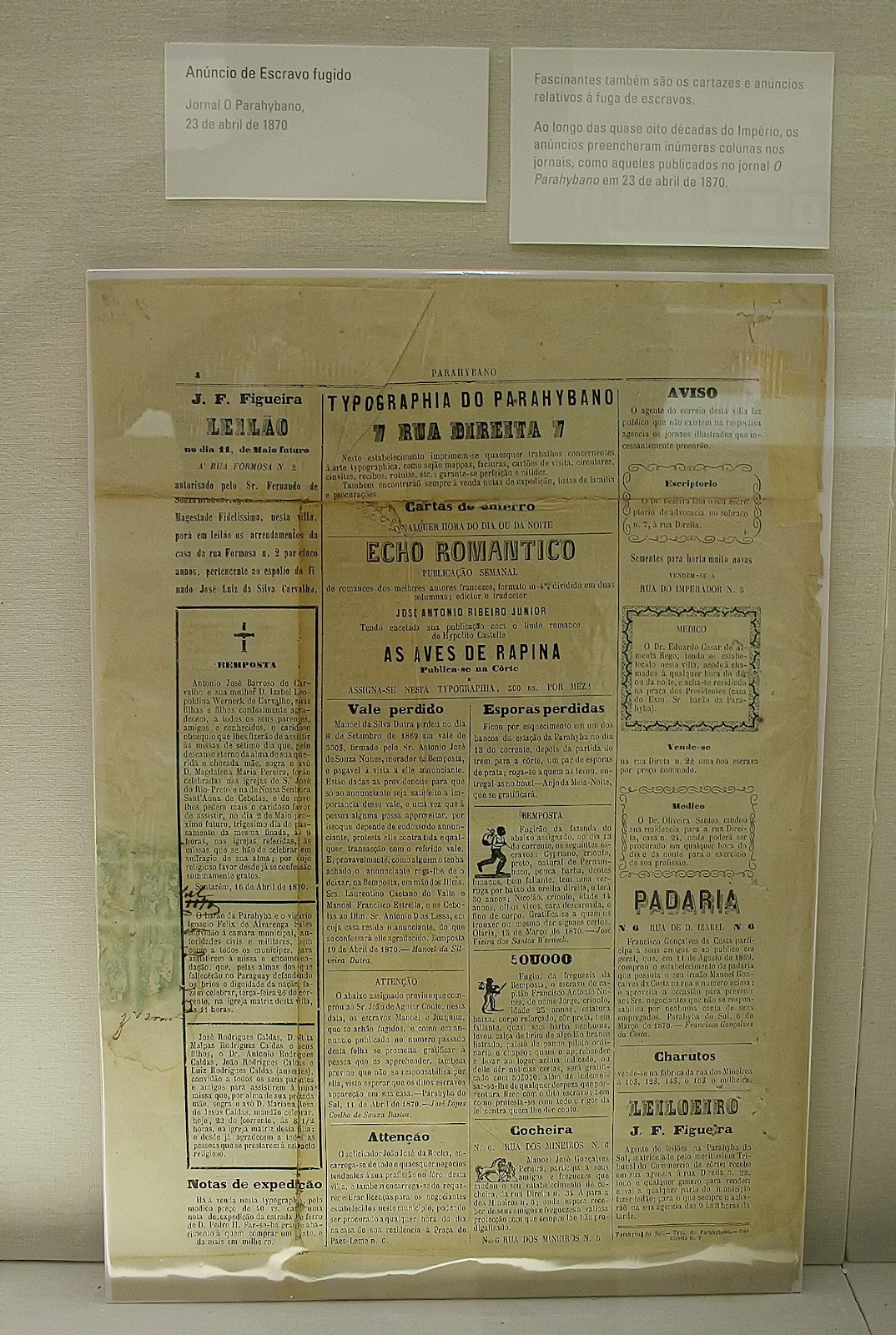 la fuga de un esclavo. Diario “O Parahybano”, 23 de abril de 1870. Era común anunciar en el diario la fuga de